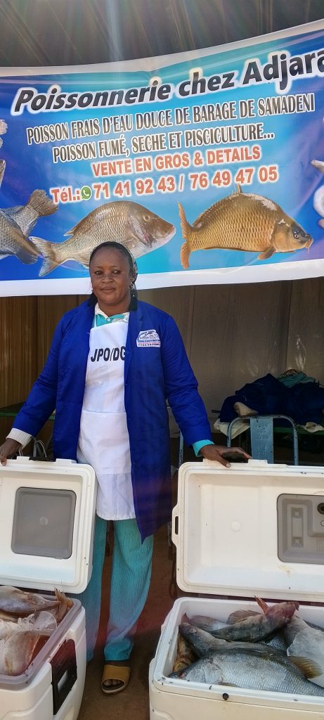 qui vit à Bama (localité située à Bobo dioulasso), se ravitaille au barrage de Samandéni chez ses pêcheurs. Celle qui n’a pas pu contenir sa joie, a confié être heureuse parmi les exposant.e.s en précisant qu’elle proposait plusieurs variétés de poissons « On propose plusieurs types de poissons : les capitaines, les carpes, les poissons chevaux, les poissons concordes , les machoirons, les sardines, il y’a beaucoup de variétés ».