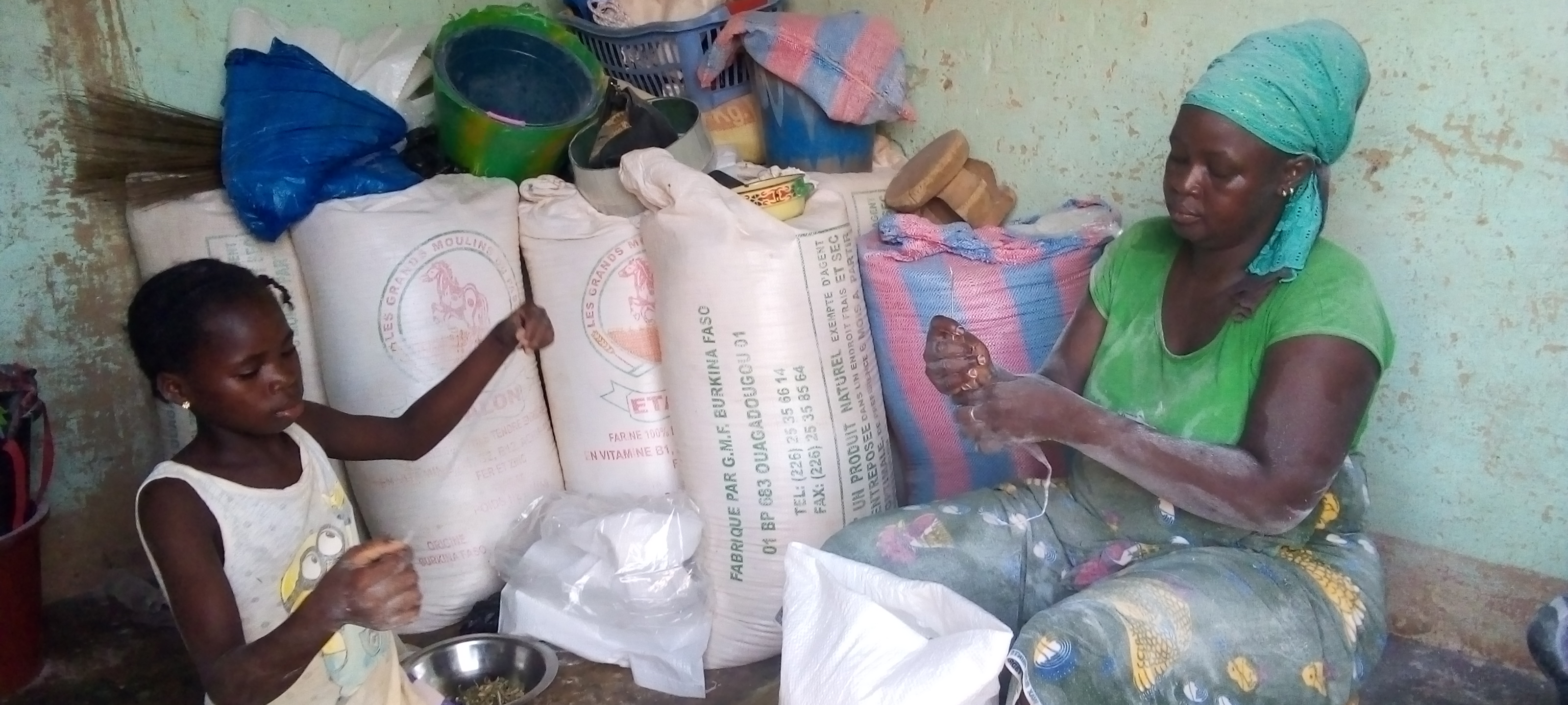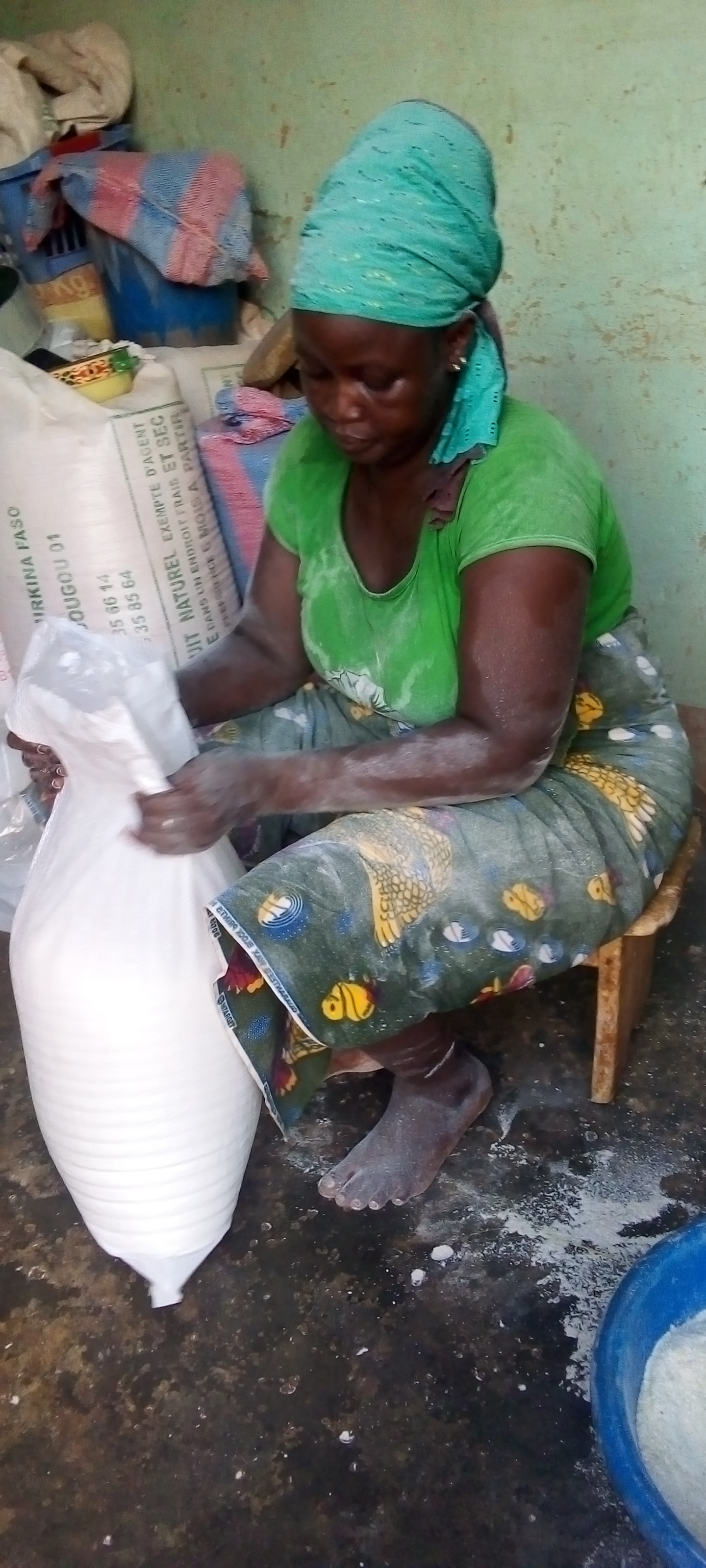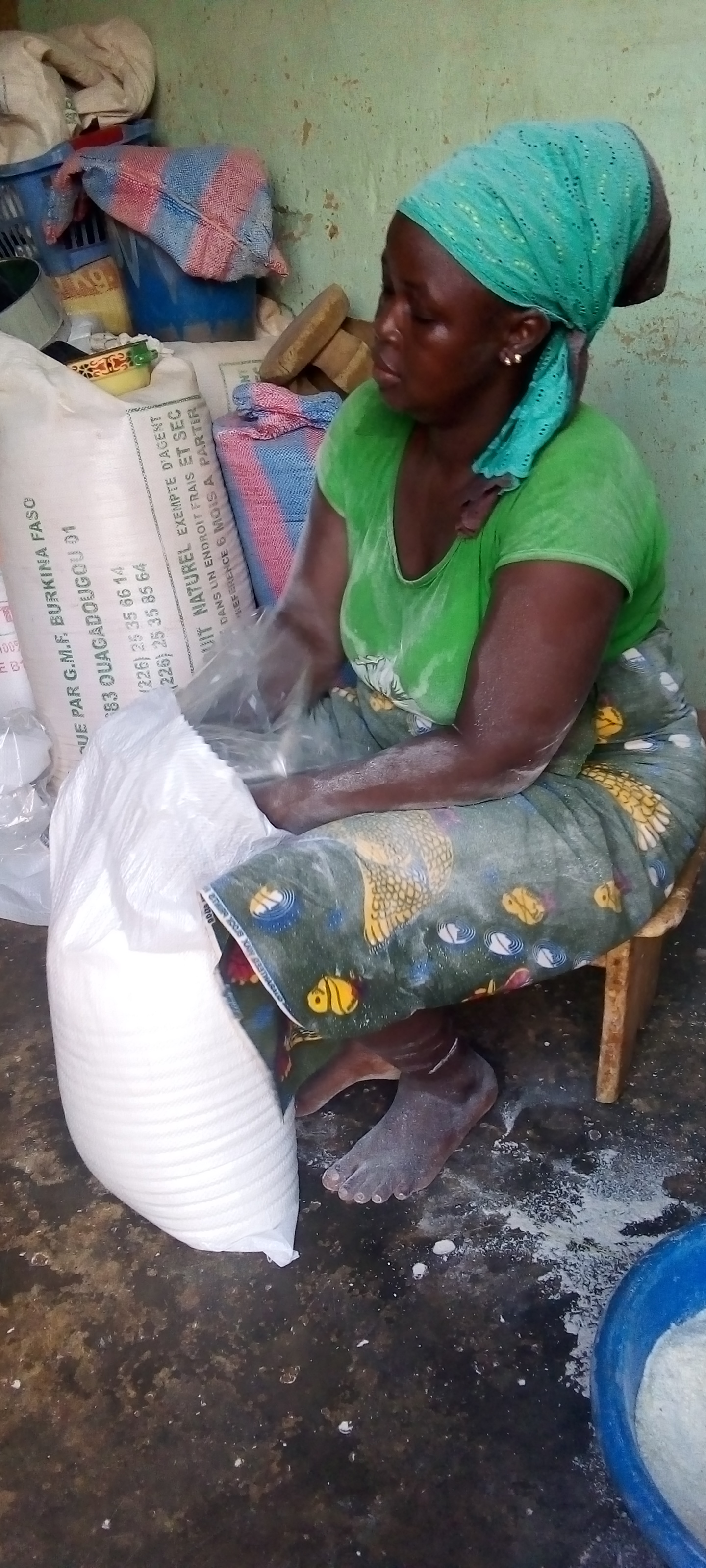 Mes farines étant de meilleure qualité, ce sont mes clients qui donnent mon contact soit à leurs amis, soit à leurs parents ou connaissances ou à des tierces qui, à leur tour viennent s’en a procurer et ainsi de suite et d’autres même que je ne connais pas et qui sont en province, me transfèrent leur argent et je les envois la farine via les transporteurs en commun, a souligné Adjara et de conclure que c’est une personne qui la ravitaille en sacs et sachets pour farine (plus de 15000Fcfa) sans oublier qu’elle continue aussi de vendre la semoule de mais qu’elle vend à 10000Fcfa pour les 12 platées et vend aussi en détail.