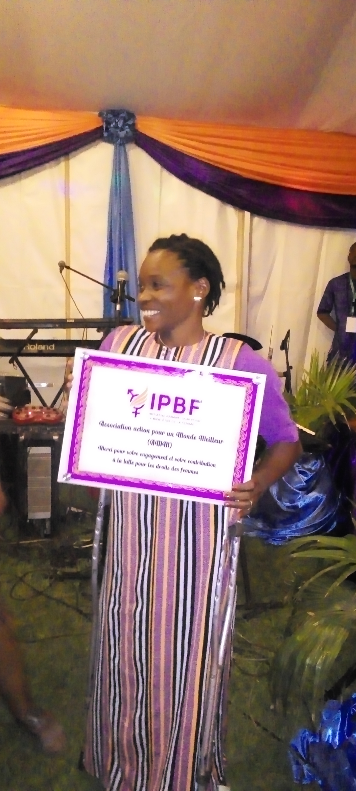 Sakinatou Ouédraogo, membre d’une association de Défense des Droits des aide-ménagères et domestiques (ADDAD-Burkina) créée par les aide-ménagères elles-mêmes ( celle dont l’association a reçu une attestation de reconnaissance) qui avait de la peine à s’exprimer, tellement animée de joie et de reconnaissance aussi envers IPBF, a encouragé l’initiative « parce que c’est toute la 1ère fois que moi en tant que jeune fille aide-ménagère qui milite depuis sa tendre enfance(9ans), aujourd’hui, se voit décorée, se voit vraiment donné un prix et je pense à toutes ces milliers de jeunes filles (1700 aides ménagères qui ont été décorées aujourd’hui par cette organisation, c’est de dire merci .
