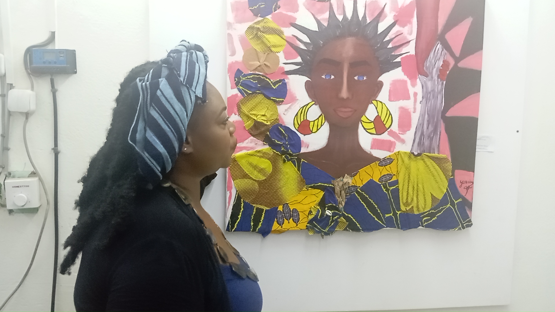 « Ce tableau représente une Dame africaine avec tout ce qui va avec l’Afrique avec des boucles d’oreille appelées « Appolo », elle a des yeux bleus et le bleu pour moi signifie la PAIX « La femme appelle à la COHESION et à la RECONCILIATION » La FEMME a un impact sur la PAIX.