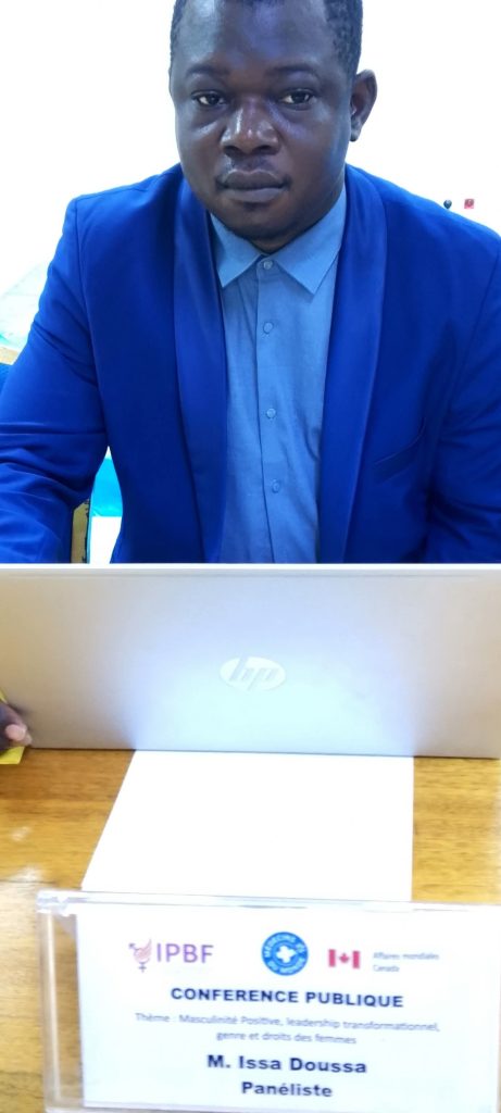 dans sa communication sur la « Masculinité positive comme levier de transformation sociale ». Pour lui, les hommes n’étaient pas vraiment impliqués dans la lutte aux cotés des femmes et malheureusement, ça  ne produisait pas véritablement les résultats escomptés «  Nous savons que dans nos sociétés, lorsqu’une femme décide par exemple d’aller pour une activité, il faut qu’elle ait l’autorisation de son mari et cette masculinité positive vise véritablement à impliquer davantage les hommes dans les activités de sensibilisation, elle vise à expliquer qu’en réalité lorsqu’on dit que vous êtes un homme, vous devez utiliser ce pouvoir que vous avez ( c’est-à-dire  contribuer à la lutte pour les Droits des femmes) et  en tant qu’homme, ne  pas brandir les muscles qu’on a l’habitude de le voir, mais utiliser cette force que nous avons pour accompagner les femmes. Dans certains projets, nous avons vu des hommes accompagner leurs femmes ; c’est aussi leur manière d’accompagner leurs femmes. Cette masculinité positive, c’est de faire en sorte que les hommes puissent également s’intéresser aux questions des Droits des femmes, qu’ils puissent s’engager véritablement de la plus belle des manières ».