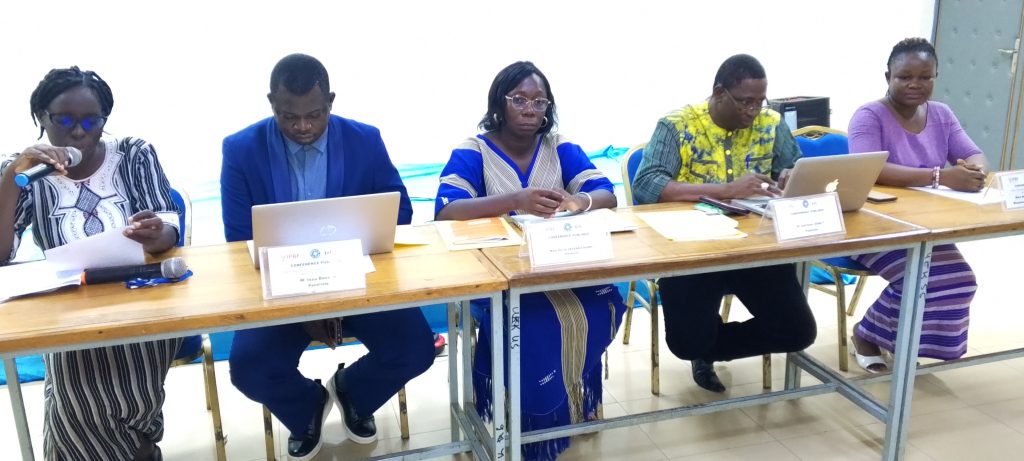 Le presidium avec la Chargée du genre de IPBF à l’extrême gauche,la Responsable programmes de IPBF, Elisabeth Zoundi à l’extrême gauche et les panelistes au centre.