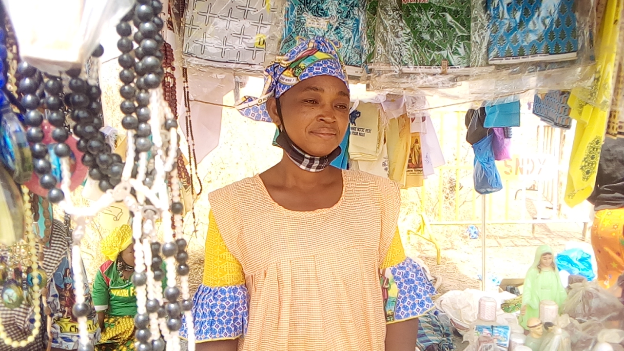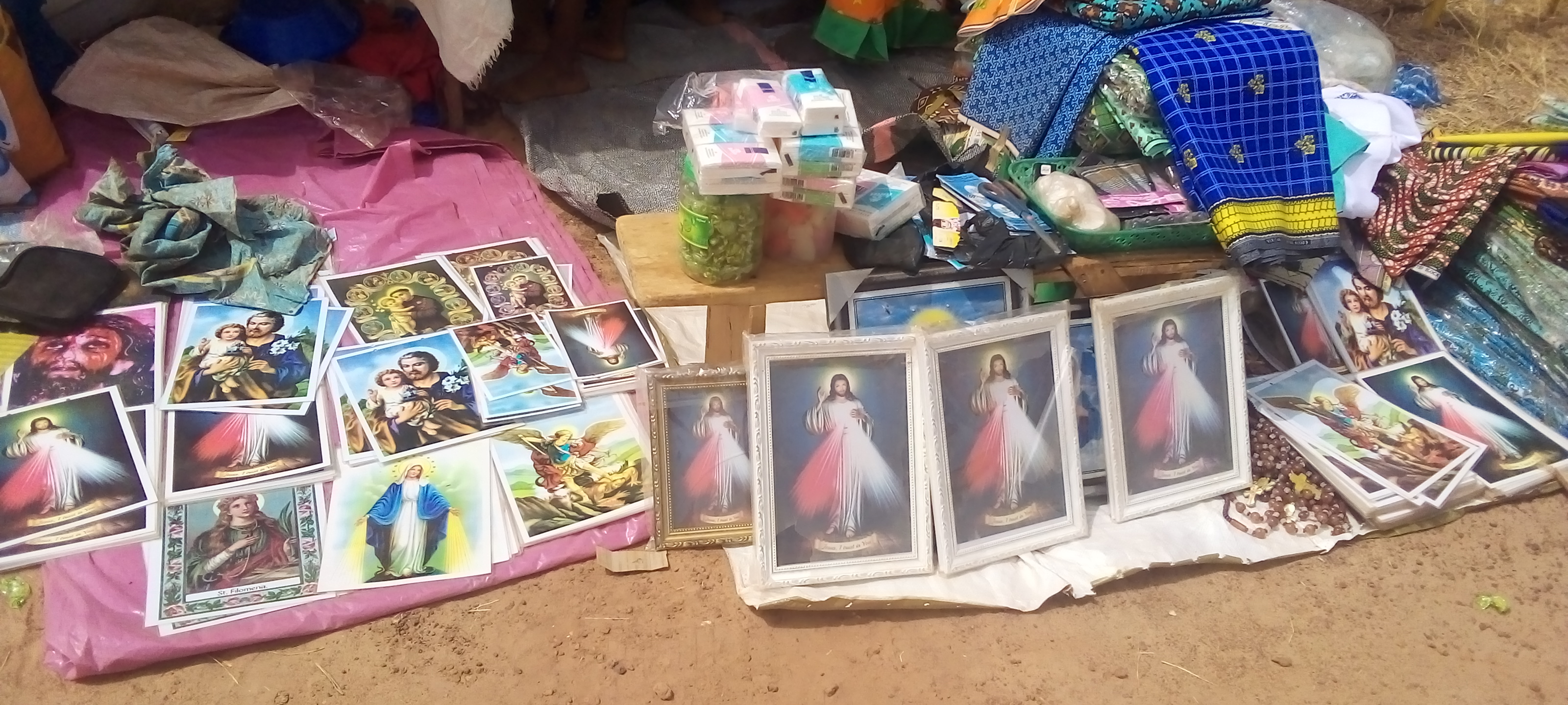 Cette femme qui est venue implorer Dieu afin que règne la paix dans son pays, a confié qu’en plus de la prière (1er objectif de sa venue au Sanctuaire marial), elle a profité vendre des objets de piété tels que les croix, les chapelets, les bibles et tous les objets utilisés par les Catholiques pour prier « il y’a aussi des pagnes et les prix des objets varient de 200 à 12000Fcfa, pour le marché, je ne me plains pas ».