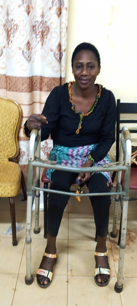 Celle qui était très bien portante, était loin de s’imaginer qu’un jour, son handicap viendra d’un coup « Au début, ça commencé avec une seule jambe ; celle de la droite et il y’eut des moments pour marcher, c’était un problème et quand je marchais, je tombais de moi-même en cours de route et souvent en m’arrêtant, le temps de me rendre compte, je marchais à reculons. C’est après, que je me suis rendue compte que j’avais un problème de nerfs. Nous avons cru que c’était passager, malheureusement, ça atteint le 2ème pied et finalement, je suis devenue handicapée moteur ».