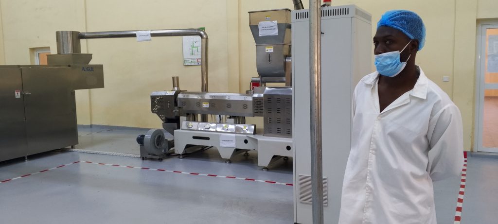 « Le processus de production des produits est basé sur la cuisson-excusions et bien avant cela, nous avons différentes étapes : l’étape du pré-traitement, du prémélange, le convoyage sur l’exclusion et après nous obtenons les flocons qui sont réduits en farine et à ce niveau, on fait le mélange pour obtenir la farine et s’en suit le conditionnement.