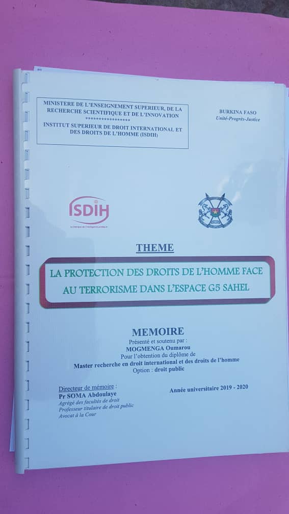 Il s’est tenu ce lundi 27 décembre 2021 sous la direction du Pr Soma Abdoulaye, une série de soutenance de mémoire de Master II en droit international et des droits de lhomme à l’ISDIH. L’impétrant Oumarou Mogmenga a soutenu avec brio son Mémoire de Master II recherche sur le thème  » La protection des droits de l’homme face au terrorisme dans l’espace G5-Sahel ». Le jury, présidé par le Pr Soma, a salué la qualité du travail de l’étudiant et les efforts de recherche. Il a formulé des observations et suggestions pour amélorer le travail.