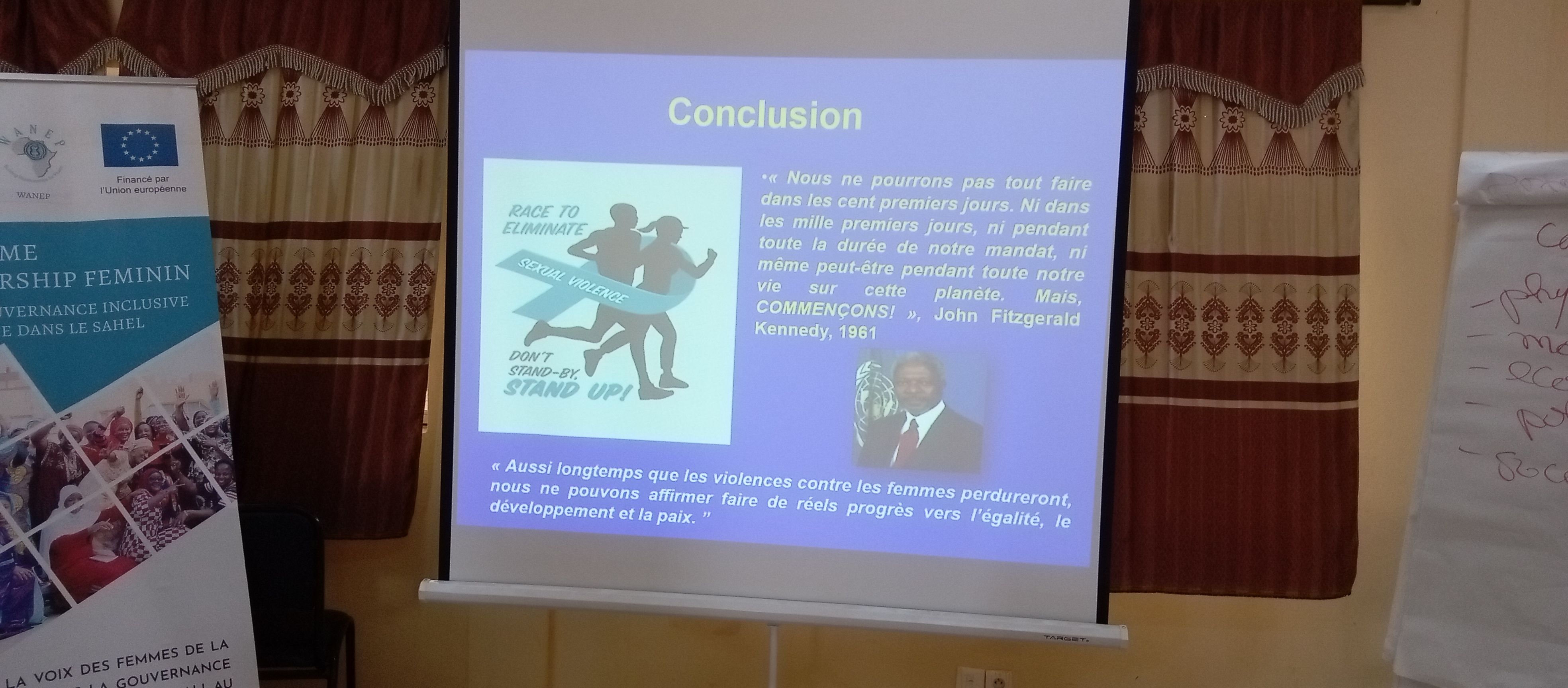 ‘ki, cette formation entre dans le cadre du programme de leadership féminin (PLF) pour une gouvernance inclusive de la sécurité au BF, au Mali et au Niger , programme mis en place par DDG (groupe danois de déminage) en consortium avec le WANEP (réseau ouest africain pour l’édification de la paix) dans le but de former des femmes qui , à leur tour restitueront ces formations qu’elles ont reçu « on a suivi plusieurs formations que ce soit ici au Burkina ou à Bamako et cet atelier est un atelier de restitution de formations que nous avons pu bénéficier. Le PLF est financé par l’Union Européenne) ».